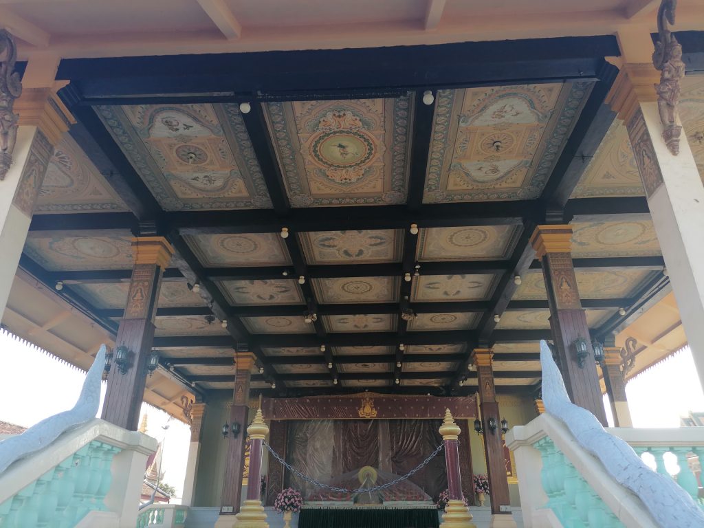 Bevor man einen Tempel betritt, muss man die Schuhe ausziehen. Das finde ich richtig cool, ist ein ganz neues Gefühl, man erlebt alles viel intensiver. So humple ich mit meinem dicken Zeh durch den Tempel und bewundere die hohen, stuckverzierten Wände. Im Tempel kann man sich setzen, meditieren, beten oder sich einfach umsehen, wofür ich mir gerne Zeit nehme. Fotos soll man nicht machen, am Eingang steht extra ein Wachmann, der den Leuten verbietet, Fotos zu machen.