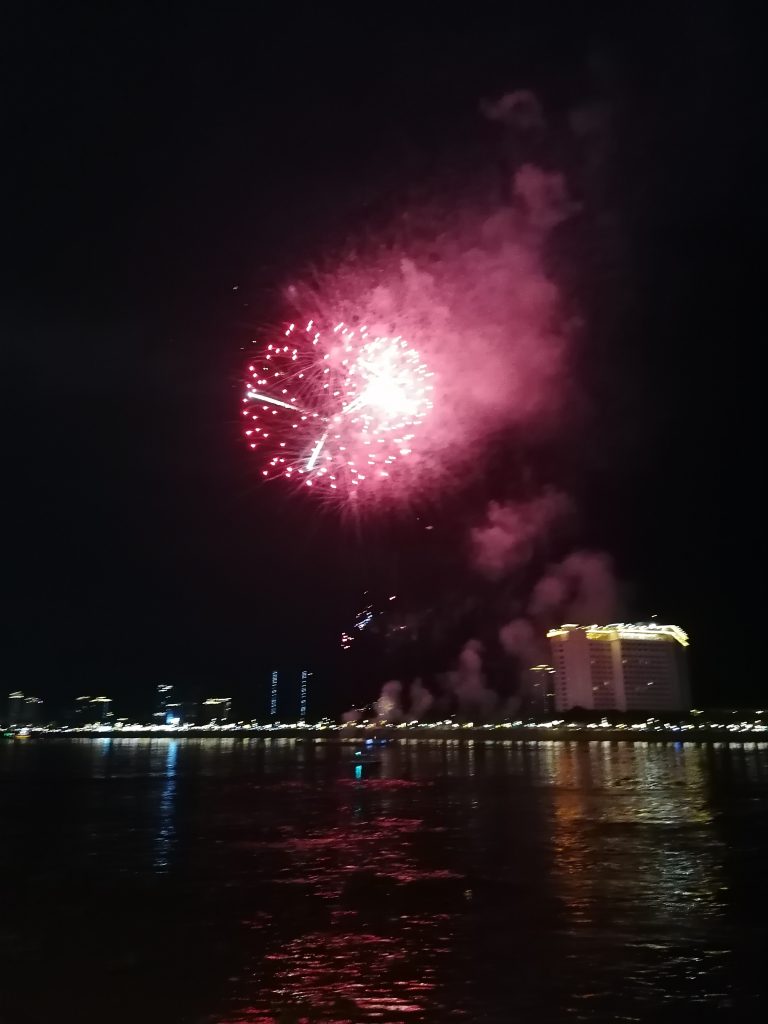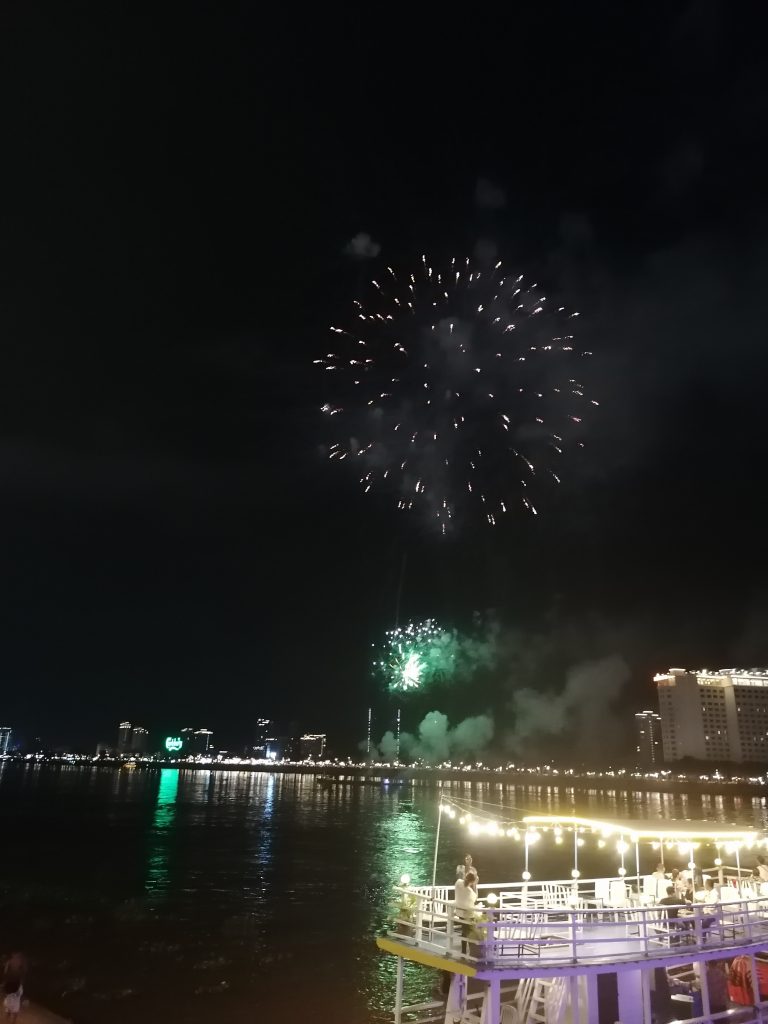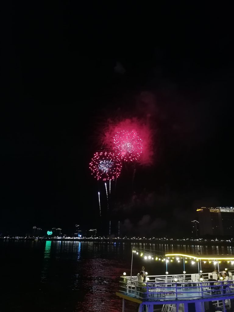 Während wir uns übers Reisen unterhalten, spricht uns ein Mädel an, ob wir spontan Lust haben, das Feuerwerk zum heutigen Unabhängigkeitstag zu fahren. Gurkenrum und ich gucken uns an… ja klar! Kurz darauf sitzen wir in einem TukTuk und gleich danach am Ufer des Mekong Flusses. Marie wurde von ihrer Freundesgruppe im Stich gelassen, eine echt miese Geschichte und wollte den Abend nicht verstreichen lassen. Deshalb hat sie einfach zwei Fremde angesprochen… wofür wir sehr dankbar sind.