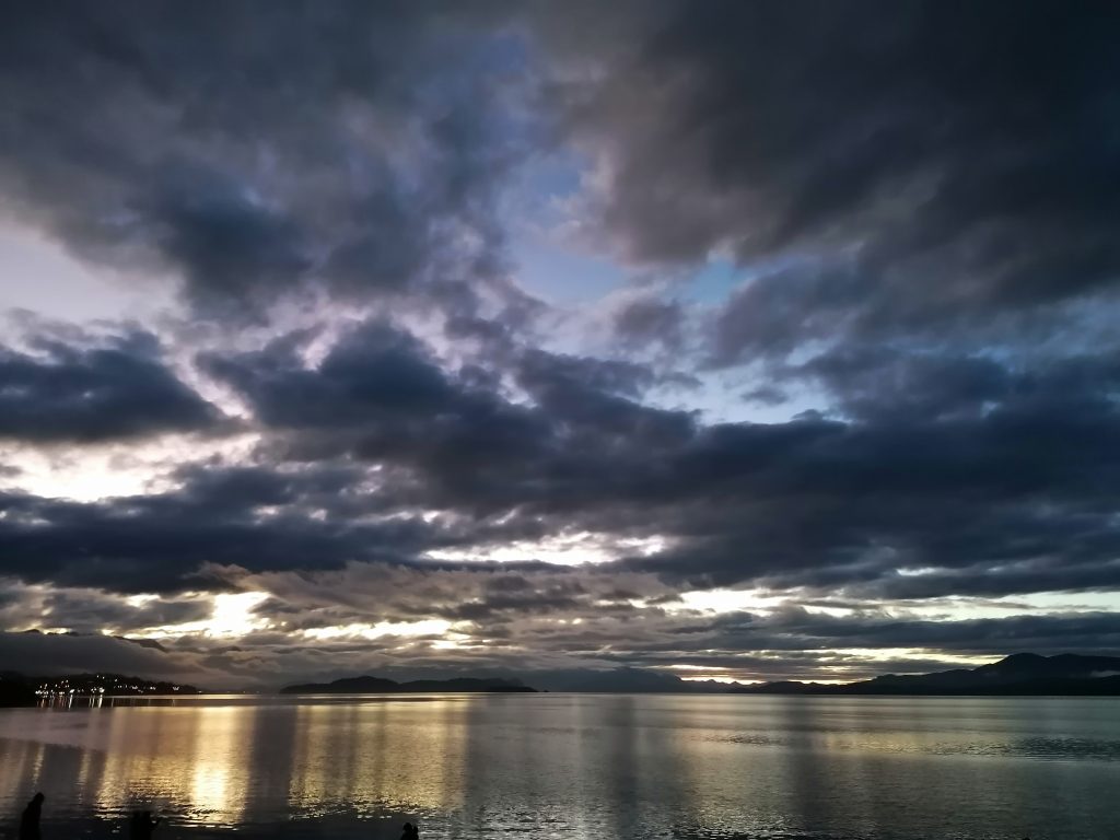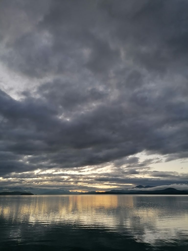 Der ruhige See wirkt wie ein Spiegel und reflektiert das Farbenspiel der Sonne mit den Wolken… es wird mit jeder Minute schöner…
