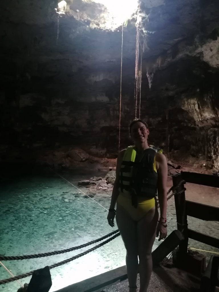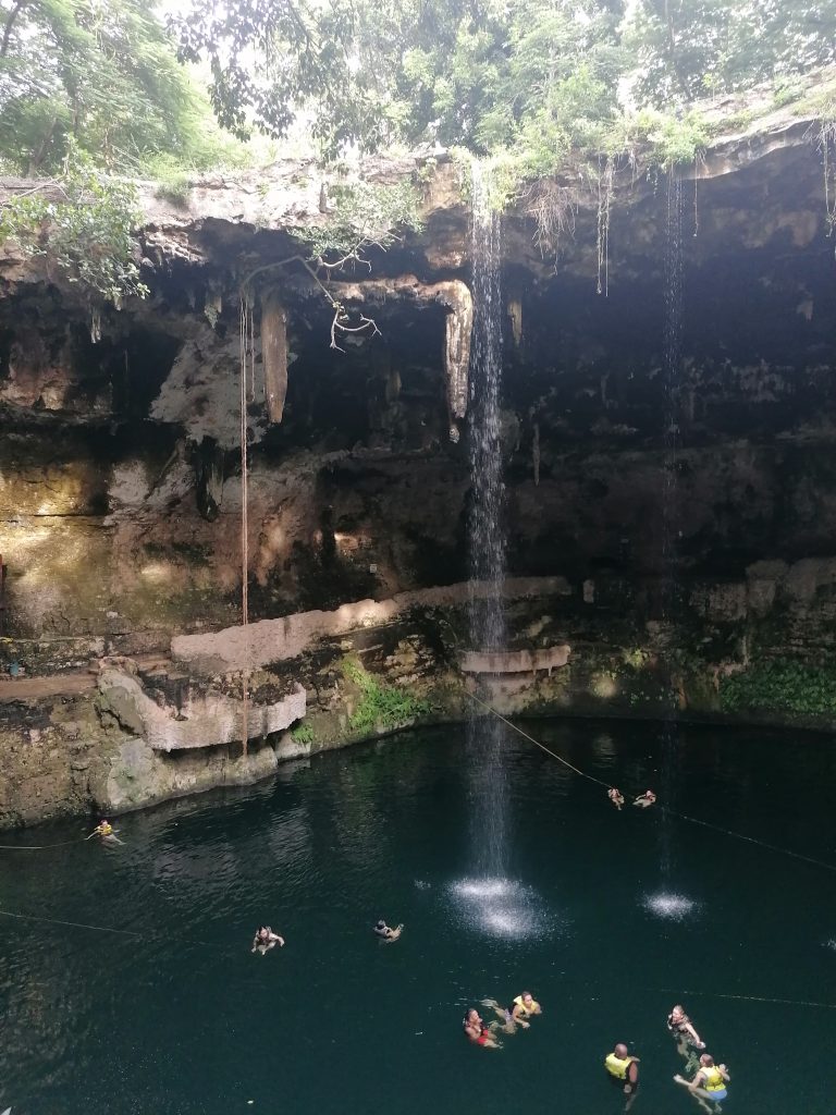 Dann springe ich wieder auf mein Fahrrad. Auf dem Rückweg komme ich an einem Kokosnussstand vorbei, an dem ich mir eine frische Kokosnuss gönne, deren Wasser ich gierig aufsauge! Es ist auch wieder eine wunderschön Rückfahrt. Ich gebe mein Rad ab und beschließe dann, noch zu der Zenote in der Stadt zu gehen, die ich am Tag zuvor schon gesehen hatte. Dort muss ich kurz warten, da nur so viele Leute reindürfen, wie es Rettungswesten gibt. Ich ziehe mich um, dann darf ich auch schon runter. Diese ist besser besucht, aber es sind nur noch 20 Minuten, bevor der Badeort geschlossen wird. Dementsprechend leert es sich, aber ich genieße diese zwanzig Minuten nochmal total! Diese Zenote ist auch nochmal richtig toll, vor allem wegen des kleinen Wasserfalls, der von oben kommt.
