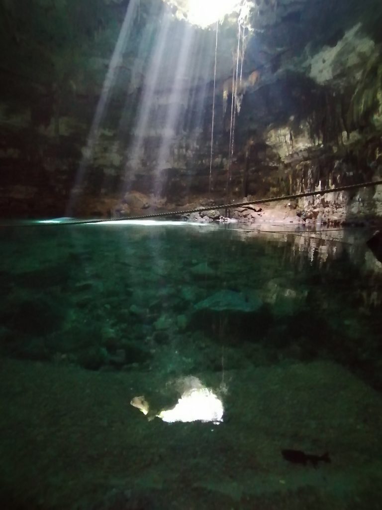 Nur ein Loch mit maximal einem Meter Durchschnitt erleuchtet die Zenote. Von dem Loch wachsen wieder die Wurzeln meterlang nach unten bis ins Wasser, oben wächst der Dschungel. Die Sonne steht fast direkt über dem Loch, sodass die Strahlen glitzernd auf das klare blaue Wasser fallen. Es ist eine perfekte natürliche Kugelhalle. Ich gehe nach unten, stelle mein Sachen ab. Außer mir kommen gerade noch drei andere Touristen rein und es gibt einen Angestellten, der aufpasst, das nichts passiert. Wir gehen alle zusammen runter, setzen uns erstmal auf die Stufen und halten die Füße ins Wasser. Der Ort wirkt wie eine Kirche, die hohen Wände, das hocheinfallende Sonnenlicht, die magische Stille.