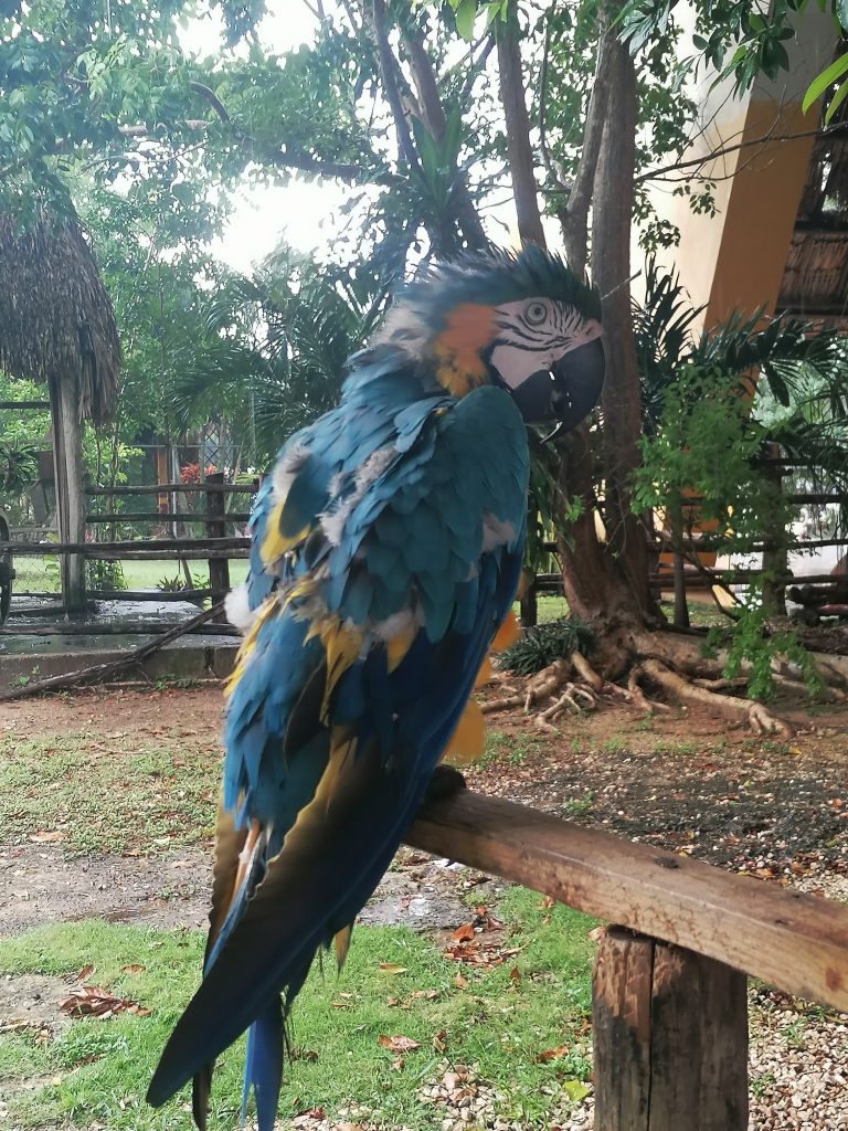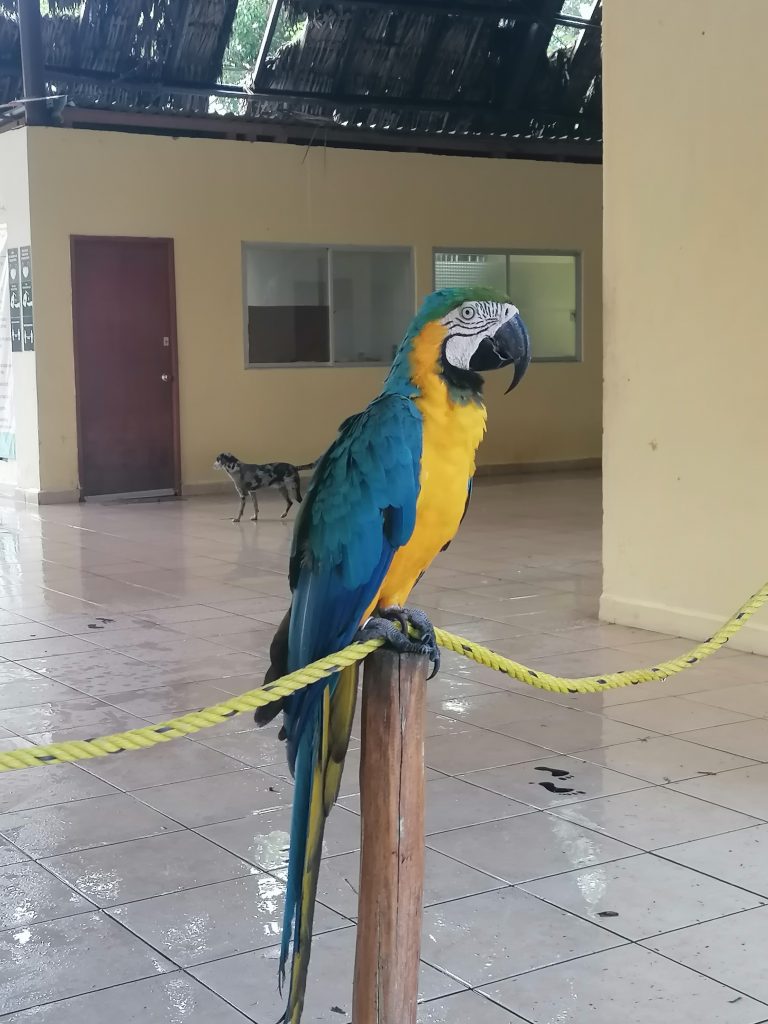 Als ich oben ankomme, regnet es gerade in Strömen. Also gehe ich wieder runter, sehe zu, wie der Regen durch die kleine Öffnung fällt (leider nicht viel) und warte, bis es aufhört. Dann wird es Zeit für den Abschied. Draußen esse ich noch die Reste meines Picknicks und stelle fest, dass am Ausgang zwei „Haustier“- Papageien sitzen. Ich nutze die Gelegenheit, da ich mein Glück für die freie Wildbahn endgültig aufgegeben habe. Es sind so wunderschöne Tiere: