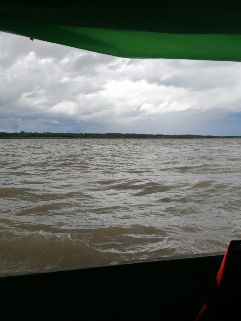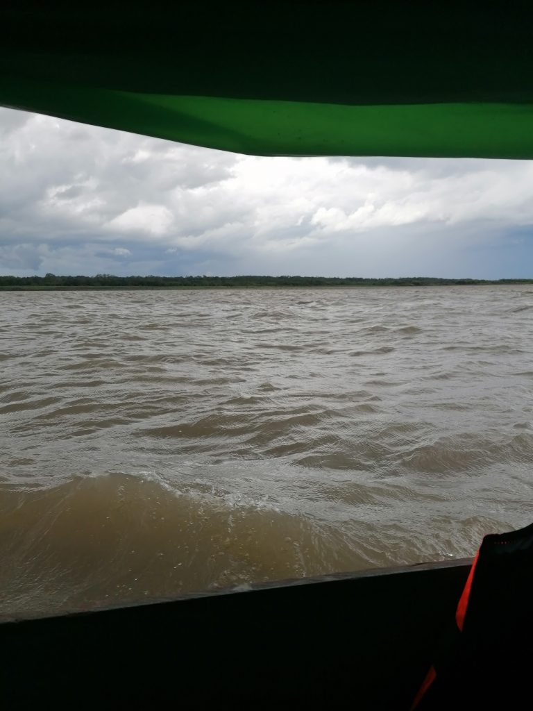 Wir fahren den kleinen Flussarm hinauf bis zum großen Fluss Ucayali der heute deutlich unruhiger ist, als die anderen Tage. Die Wellen schlagen hoch, das Wasser spritzt.