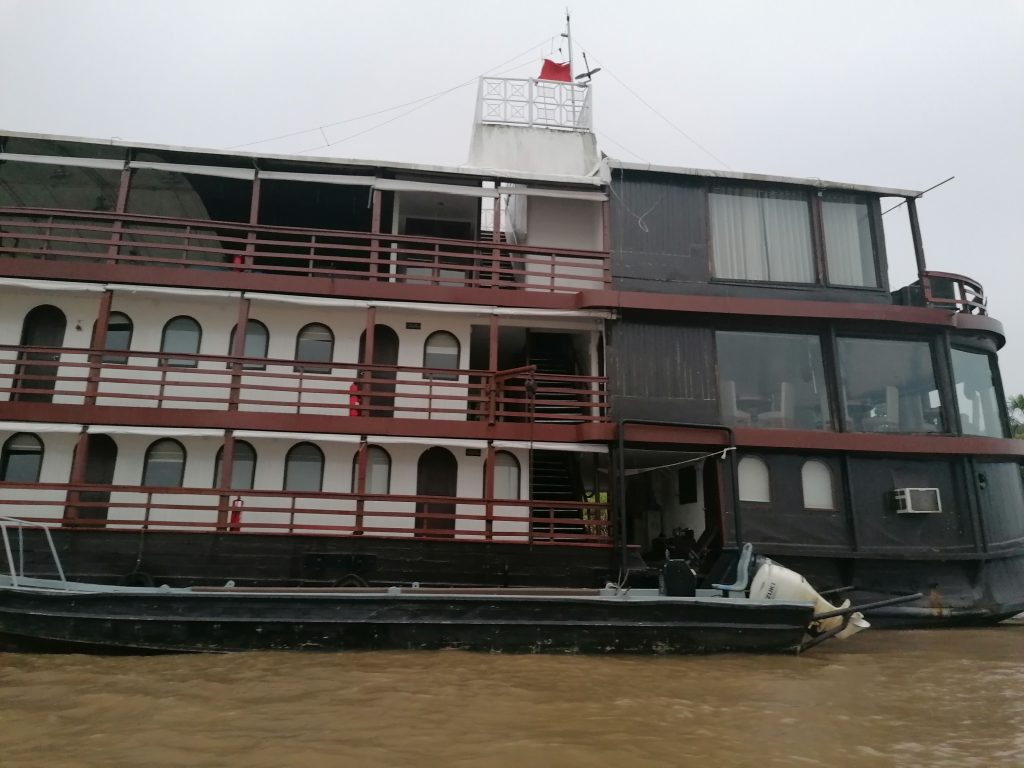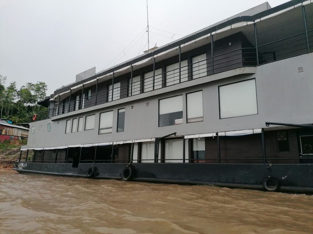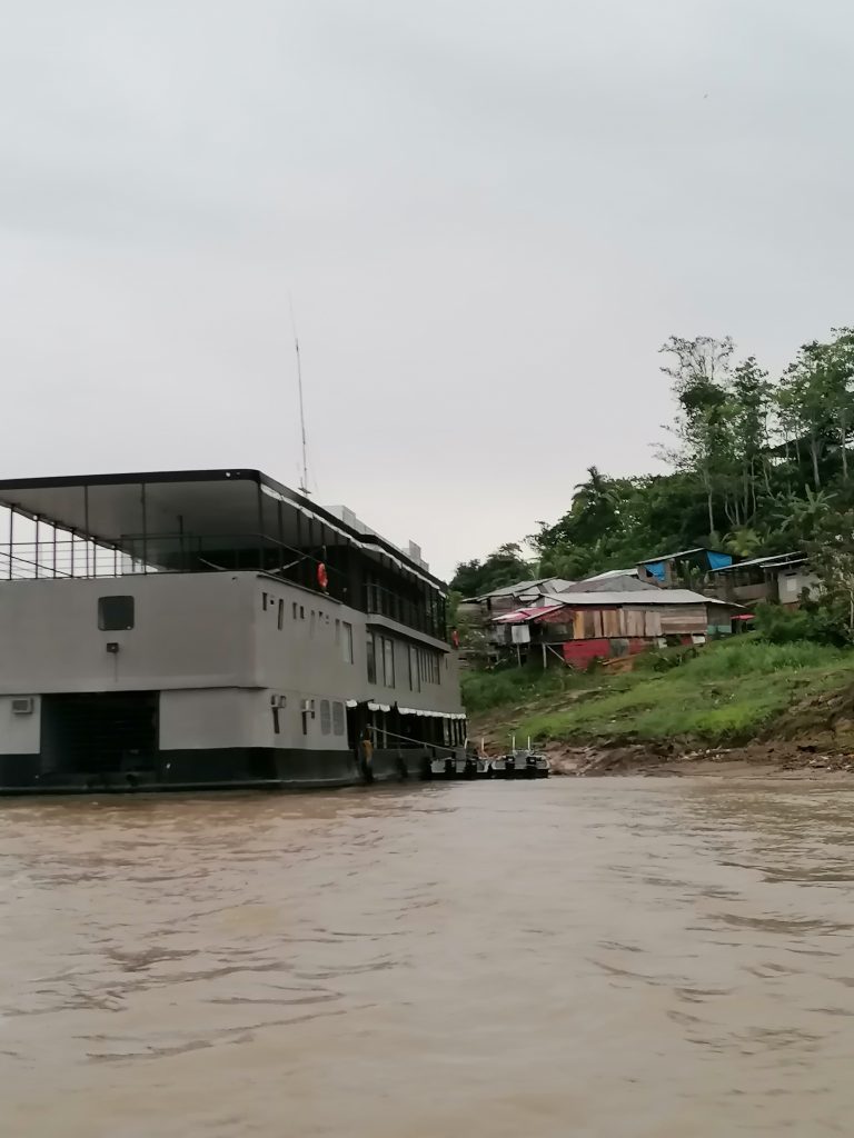 Herr Bessofski, der zuvor noch im Schoß von Frau Bessoffski lag, zieht sich schnell aus seiner Liegeposition vorne im Boot zurück und versteckt sich hinter ihr, damit sie alles abkriegt. Blöderweise sitzt er so neben mir. Ich ignoriere ihn konsequent und versuche, im Wasser Flussdelfine auszumachen. Wir fahren nochmal an dem Dorf vorbei und da ist tatsächlich nochmal der Typ mit dem Wasserschwein, dem wir zum Abschied zu winken. Nach einer Kurve wird das Wasser plötzlich ruhiger und der Großteil der Leute auf dem Boot fängt an zu schlafen. Ich schau raus aufs Wasser und versuche verabschiede mich innerlich vom Dschungel und vom Amazonas… und versuche mich von meinem schmerzenden Hintern abzulenken. Durch das wilde Wasser hat die Fahrt noch länger gedauert. Wir kommen wieder am Flussdelta mit dem Amazonas vorbei und fahren dann nochmal fast eine Stunde bis zum Anlegeplatz. Dort passieren wir ein paar schwimmende Luxushotels…